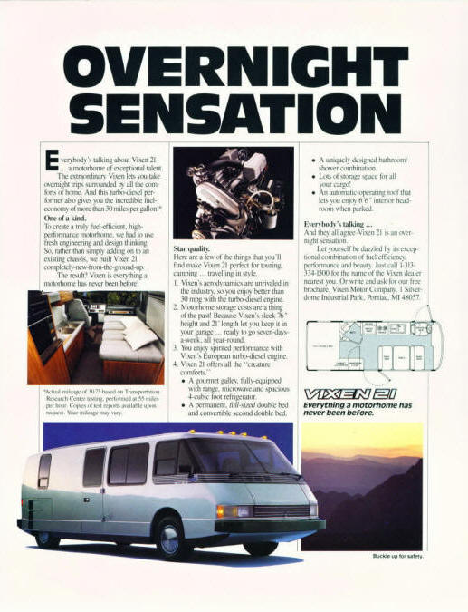 Vixen motorhomes enjoyed a short life in the late 1980s. They featured all the usual motorhome amenities, such as a bathroom, kitchenette, and bedroom. The molded fiberglass body rode atop a full-length steel frame. Most of the underlying elements came from other manufacturers: the front suspension, self-leveling rear suspension, power steering and brakes were GM; the clutch master cylinder was from Ford; the 5-speed manual gearbox was sourced from Renault. The gauges, all seven of them, were supplied by VDO.