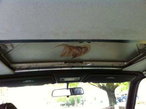 Probably the worst thing about it from my perspective is the lack of the headliner for the (non-functioning) sunroof. It seems that one of the previous owners started taking the whole thing apart in an attempt to fix the broken sunroof cable, and gave up when he found that the whole process is only a little less complicated than rewiring the space shuttle (remember the space shuttle? But I digress..). So instead of doing it right, he left the headliner panel off (and subsequently lost it) so he could operate the roof manually. It’s really very easy: you move the big black bar rearwards about an inch, and yank it rearward. Since I do most of my driving this time of year with the roof open, it’s not the absolute worst thing in the world. When it’s closed, however, it drives me batty.