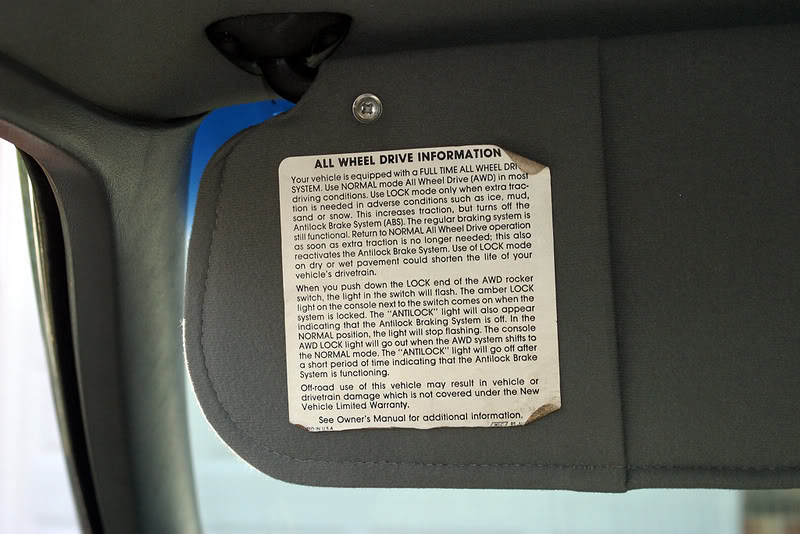 The STE had a button on the center console to engage a sort of high/low range, locking the driveline and at the same time disabling the antilock brakes. Here’s the warning sticker on the driver’s sunvisor: