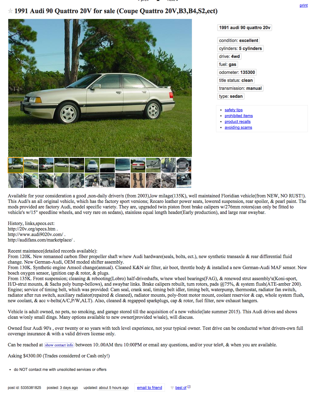 Consider this Audi 90, a rare 20V Quattro in Orlando, Florida of all places (click here if and when the ad goes away). It’s a one-owner car, local to the Sunshine State its entire life. Seems a rather oddball choice for a location that hasn’t seen snow since the glaciers receded. The seller makes himself (herself?) out to be an Audi 90 geek, which is probably the type of person you want to deal with when buying a car like this.