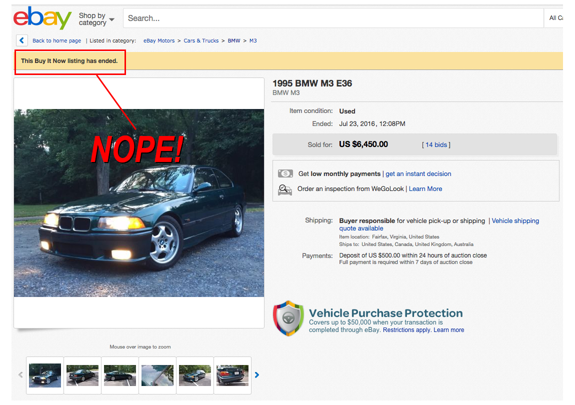 I had been looking around in certain distant markets around the country – where rust is less of a thing – for a car when Reed put the M3 on eBay. His high-bidder during the auction came across as sketchy. Sure enough, with less than two hours remaining on the auction, this bidder clicked Buy-It-Now, and almost immediately followed up with an email to Reed saying, “Yeah. Sorry about that. Clicked BIN by accident. I won’t actually be buying your car.”