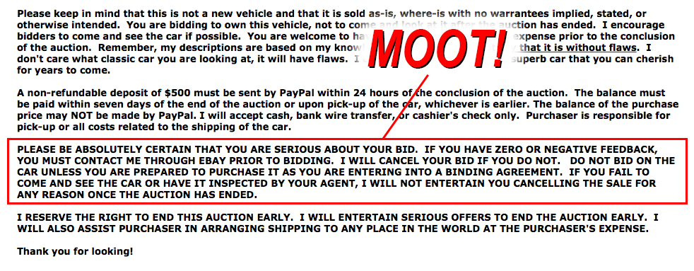 Apparently, on eBay, you no longer have to honor your commitment to buy anything. To Hell with it! I’ll just torpedo this guy’s auction after almost the entire duration because nothing actually matters anymore! Dogs and cats cohabitating, etc.