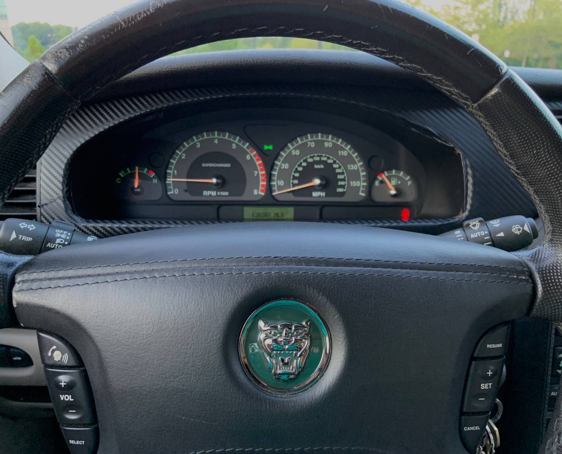 Oh, did we mention the supercharger? Under the hood lies a 400-horsepower 4.2-liter V8 force-fed by an Eaton blower running 13.1 pounds of boost. Drive runs through a ZF 6-speed automatic to the rear wheels. At the corners are Brembo 4-piston brakes and 18-inch wheels (although this one is missing the stock “Zeus” wheels). Back in the day, Jaguar claimed they weren’t hunting the BMW M5 or the Mercedes-Benz E55 AMG, but the specs are no coincidence.