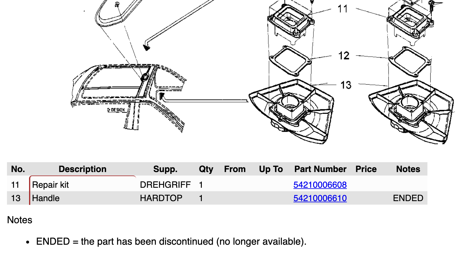I say “replacement” knob because the one currently in the car has “Webasto” molded into it. Given that Baur designed and created these convertible tops, I can’t imagine them buying pieces and parts from Webasto, a massive sunroof company at the time who were arguably a competitor.