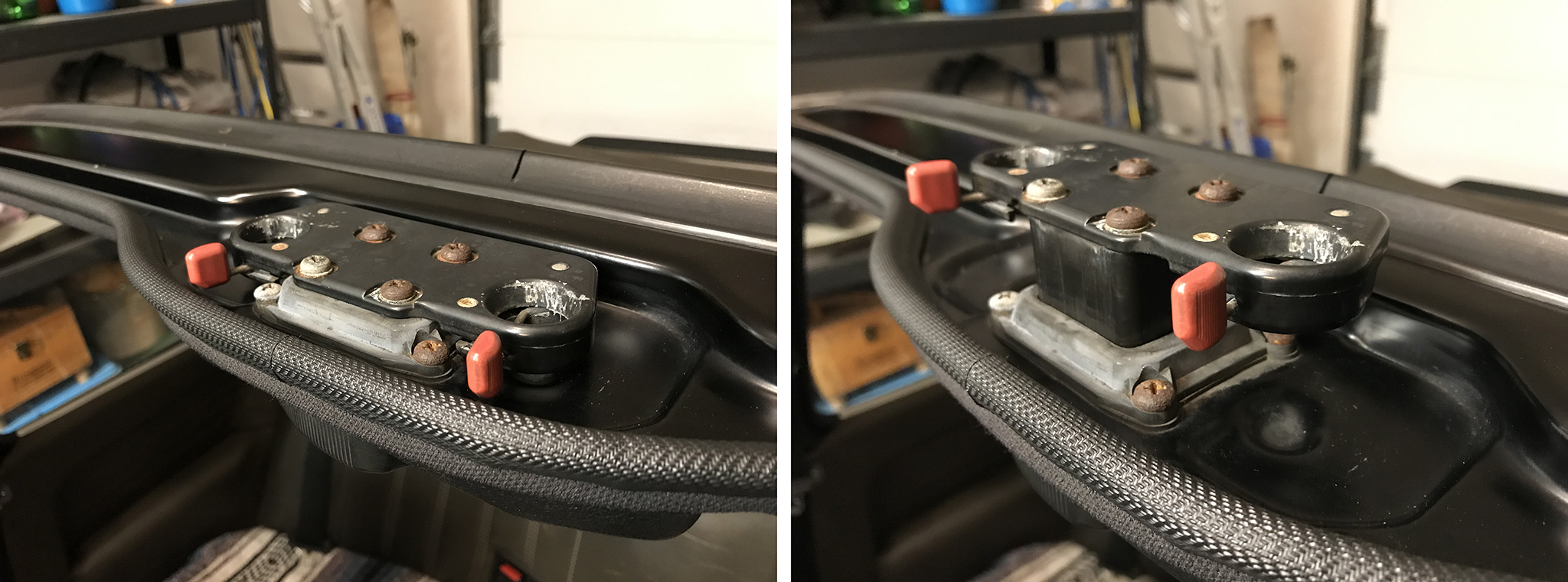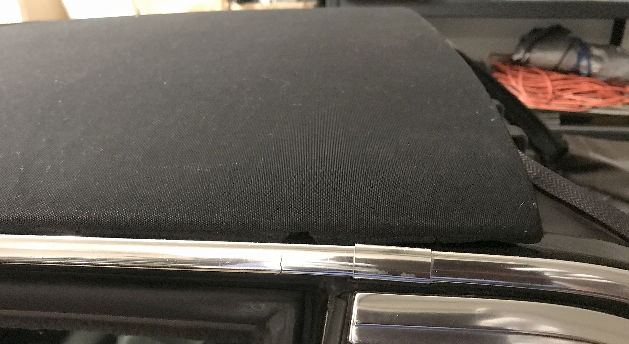 What I now see is even though the locking mechanism draws the center panel tightly to the roof bar, the panel doesn’t lay completely evenly on the car. Further, the rear folding section doesn’t line up with the center panel. There is some combination of collapsed rubber seals – that mostly still keep the water out – and adjustment of the rear section’s latches that will need to be looked at.