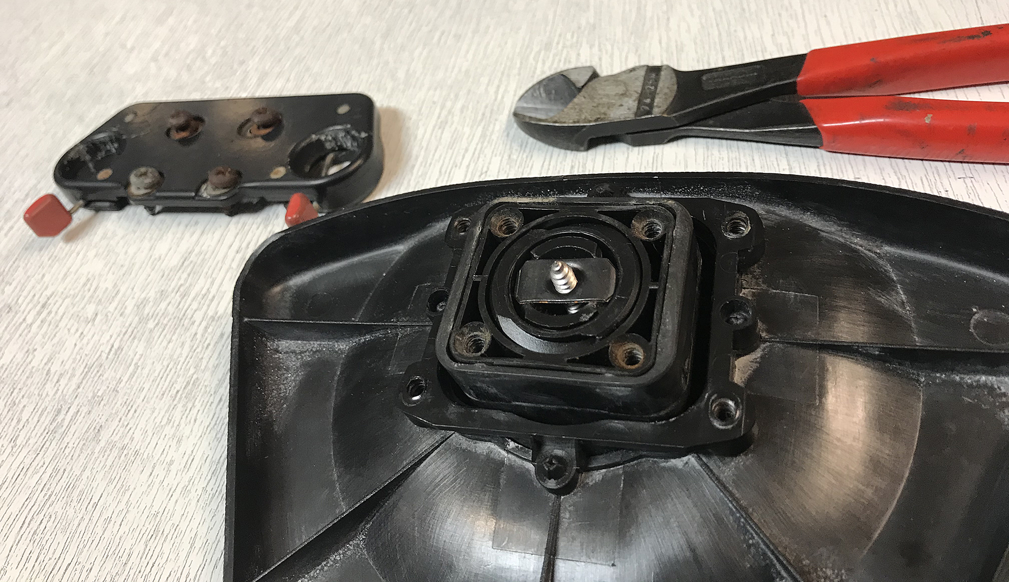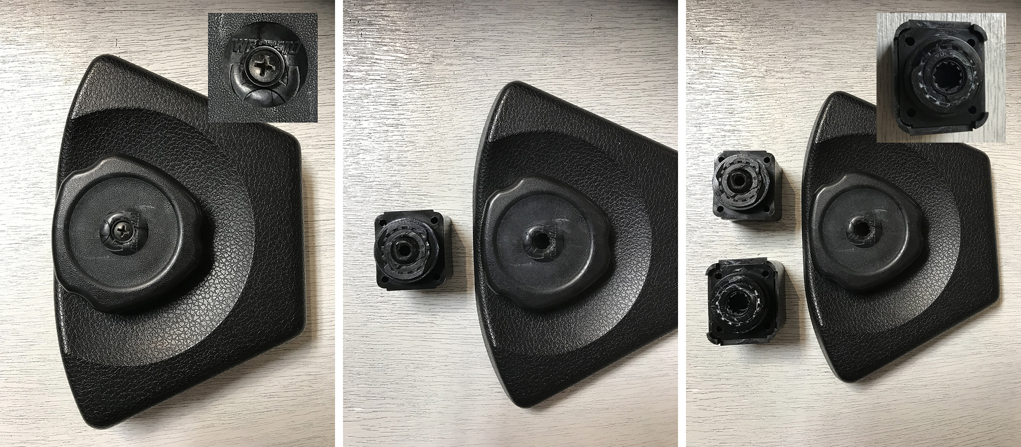 Except when I pulled the locking mechanism apart, it quickly became apparent stripped screws were not my problem. The knob itself – that which you turn to raise or lower the trailing edge of the center panel – had been broken off at some point. Originally, it had clicked into an indexed star-shaped section of the inner nested screw. Indeed, the nub of the original handle was still jammed in there.