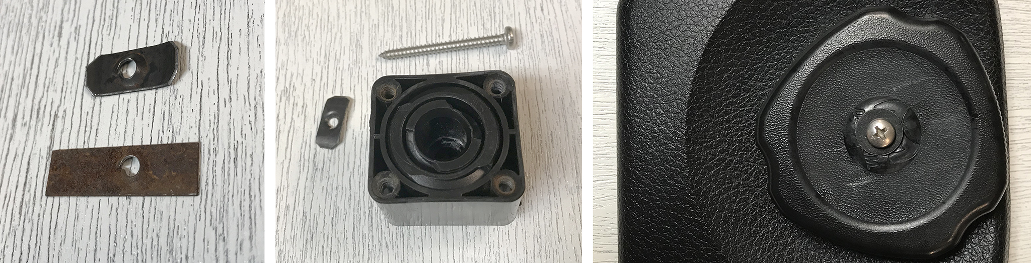 The first repair attempt required a long self-tapping screw run though the existing hole in the knob to a thin tap strip. Though the memory is faded, I’m pretty sure the strip was from a BMW Bavaria glove box. The first step was to cut the strip down to fit inside the outer nested screw. There was almost enough notch molded into the top of inner nested screw for the tap strip to grab on to. I wound up using a file to make the notch deeper, giving the tap strip a little more purchase. I then trimmed the self-tapping screw so the metal locking plate could properly seat on top.