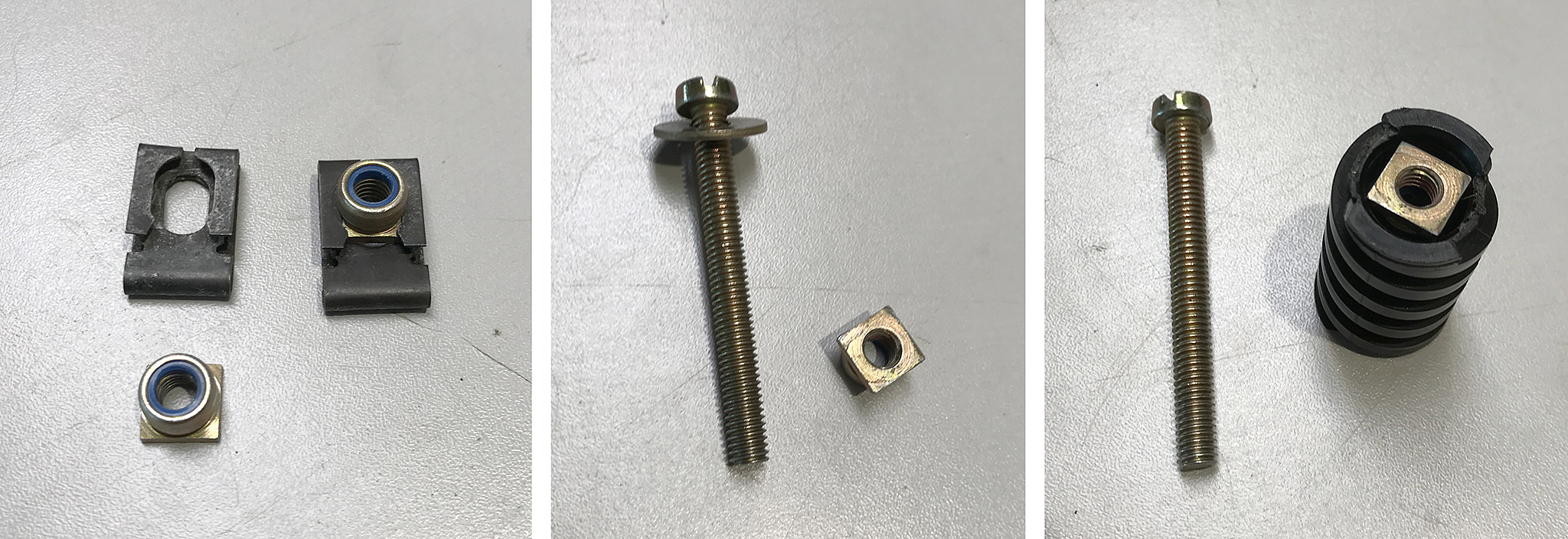 I went back to thinking about nyloc nuts. Rummaging around my hardware bins produced a clip with a square-head nyloc. I then found a long machine screw that used to hold the steering column covers together in a Bavaria (this is why you never throw away hardware). The square nyloc actually fit inside the inner nested screw and could be drawn down into the plastic, its square shoulders digging in and preventing it from turning. This effectively bound everything together, and the nyloc prevents it from loosening during use.