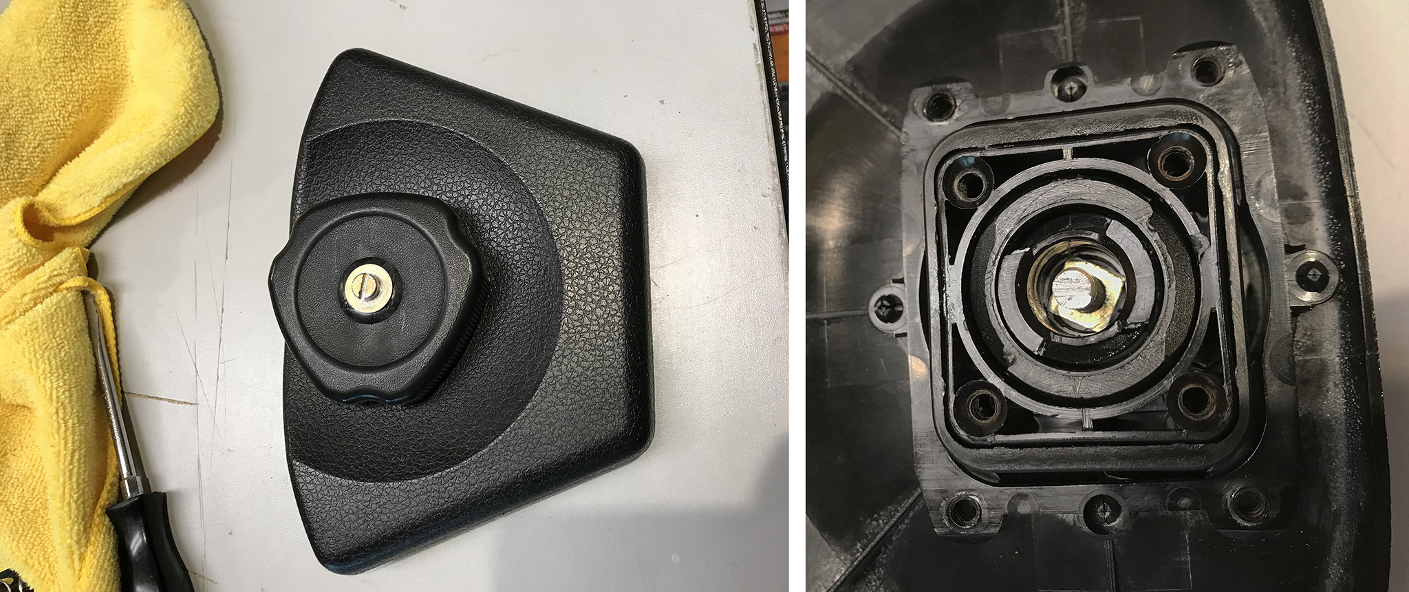 To “repair” it, someone had drilled a hole in the replacement knob and run a long screw with a cup washer through it and the inner nested screw to a tiny nyloc nut and a star washer. Even though the screw and nyloc were as tight as they could be, the knob was slipping on the nub and the inner screw (and nobody likes that).