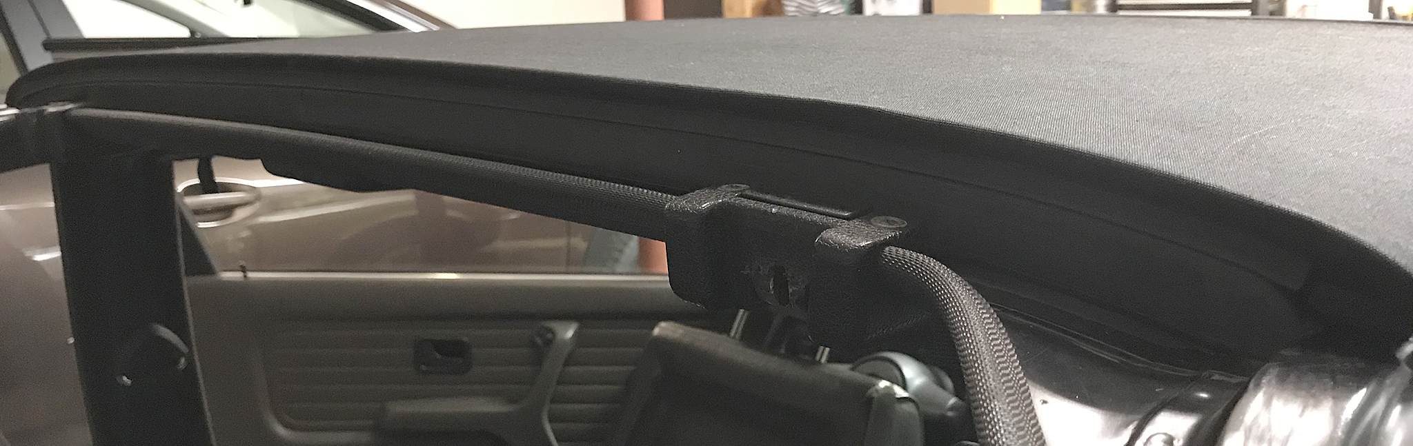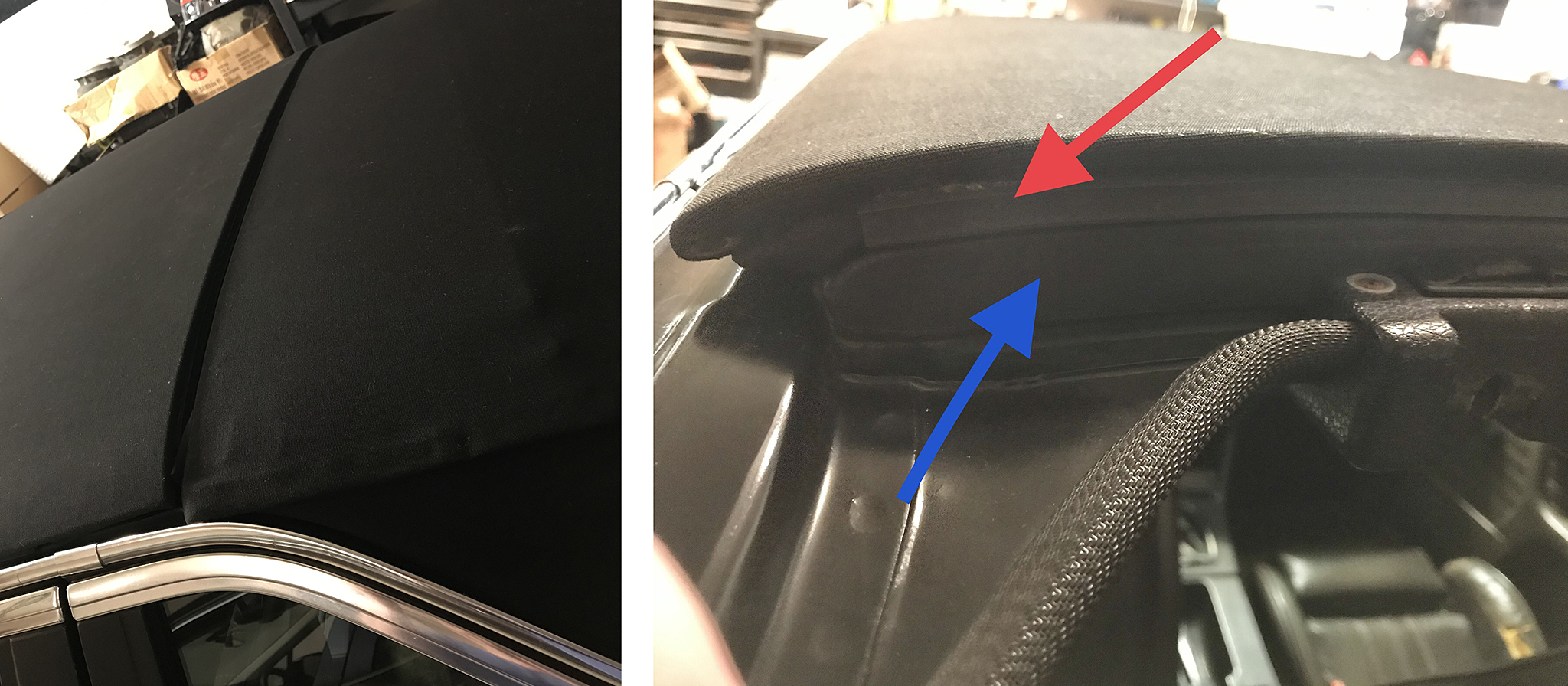 When I first met our Baur – a 1985 BMW 323i, pictured at top – six or so years ago, I was pleasantly surprised to find the TC2-specific roof pieces were almost completely accounted for and in remarkably good condition. Yes, a couple of rubber grommets were missing, and the top cover had some snaps that had pulled through. The rubber seals have also flattened a bit with time. But it was basically all there, including a nice center panel – with the original red receivers on the roof header for the panel’s locating tabs (the replacement receivers are black) – and a virtually new folding section with a beautifully clear back window.