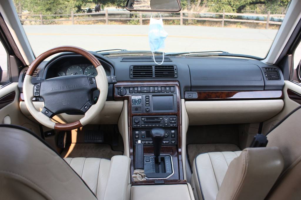 Color aside, this P38 presents very nicely. Inside the Lightstone leather looks loved but not abused. The headliner has been replaced, and the gauge cluster shows no warning lights. You can see the HVAC control panel in one of the images, and the “book” icon is conspicuous by its absence. The wood shows a deep shine, though I’m not such a fan of the two-tone steering wheel on the later P38s. I think the (used?) face mask adds a certain something to the story.