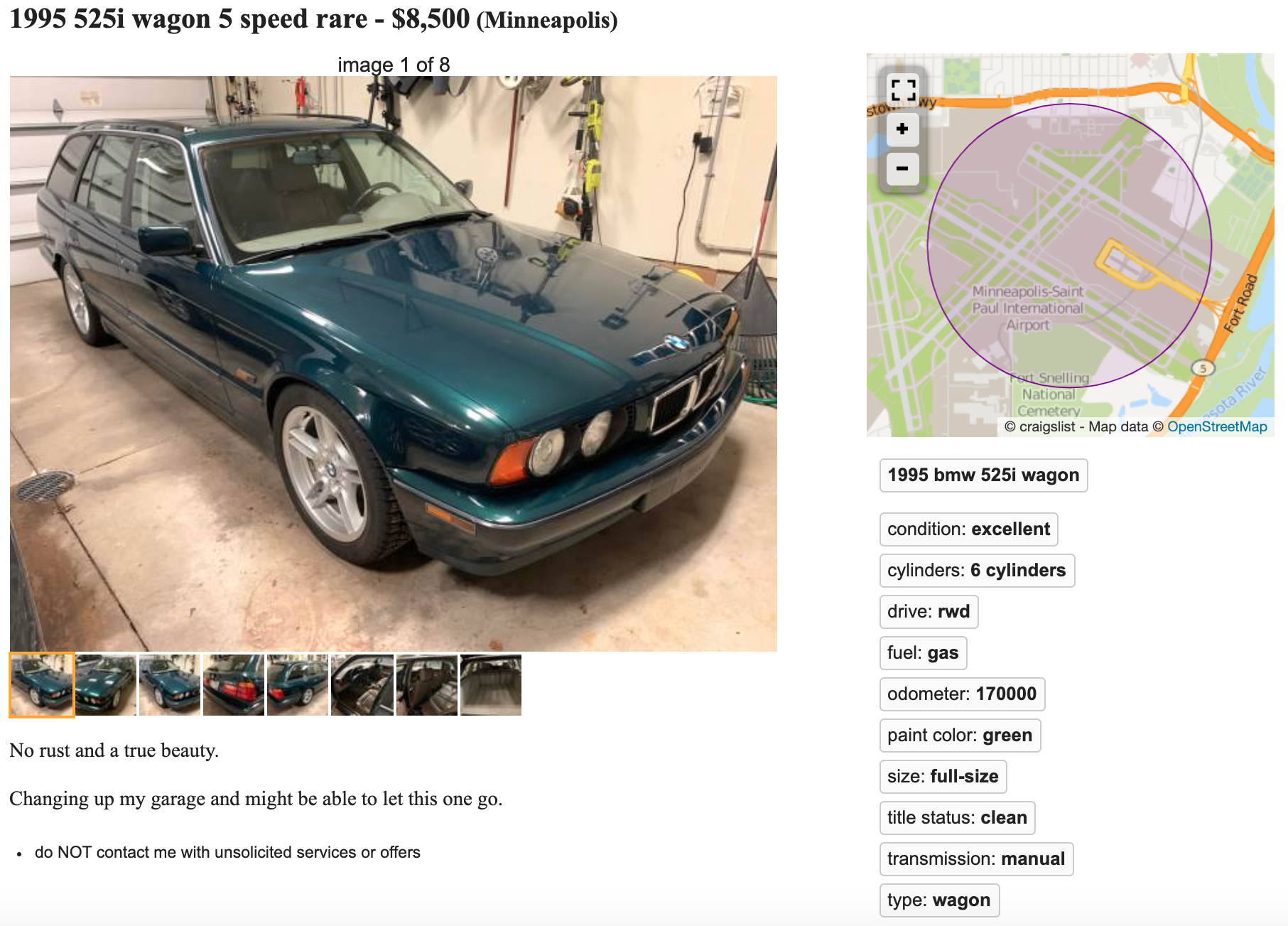I’m not actually annoyed by the lack of verbiage. I know enough about E34s in general that if I were in the market this woefully brief ad wouldn’t put me off. What I do think is a little aggressive is the $8,500 ask. But maybe I’m just living in the past, and maybe this is what an apparently clean E34 Touring with a stick swap and some minor needs now sells for. There are not a huge number of examples for sale right now to compare. So maybe it’s worth it?