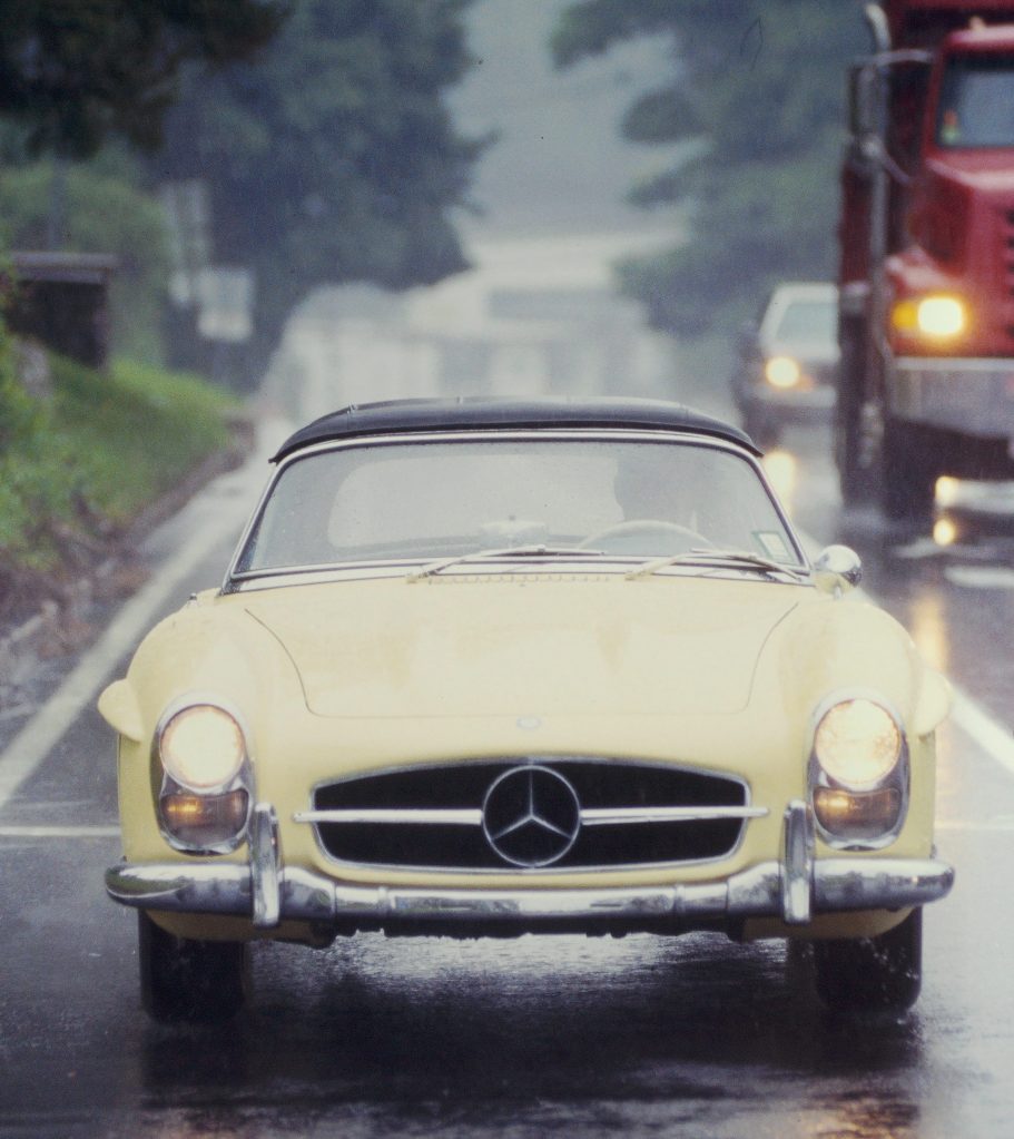 Probably the most interesting part of the road experience, even in this dismal weather, was the reaction from passers-by. On four-lane roads, other drivers sped up, slowed down, changed lanes, and drove like maniacs just to catch a glance. It’s not every day that you see a 300SL Roadster, especially in a deluge! But this car has a presence: an almost regal aura that surrounds it as it wanders about the landscape, drawing the undivided attention of everyone in its presence.