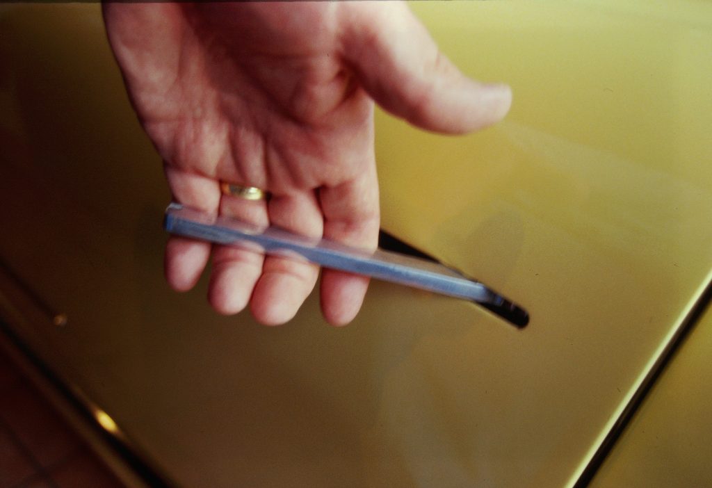 I wasn’t looking at the details, to be quite honest, until we started shooting pictures. Diligent photographer Kaveh was clicking away, but I couldn’t tell where he was aiming the camera (bear in mind – we were still shooting real, live film back then!). “Look at this,” he said excitedly, “this chrome is fantastic!” He was pointing to the chrome strip that rides the length of the door top and flows into the windshield. It looked as if it had been honed from a single piece of metal which then had a car built around it.