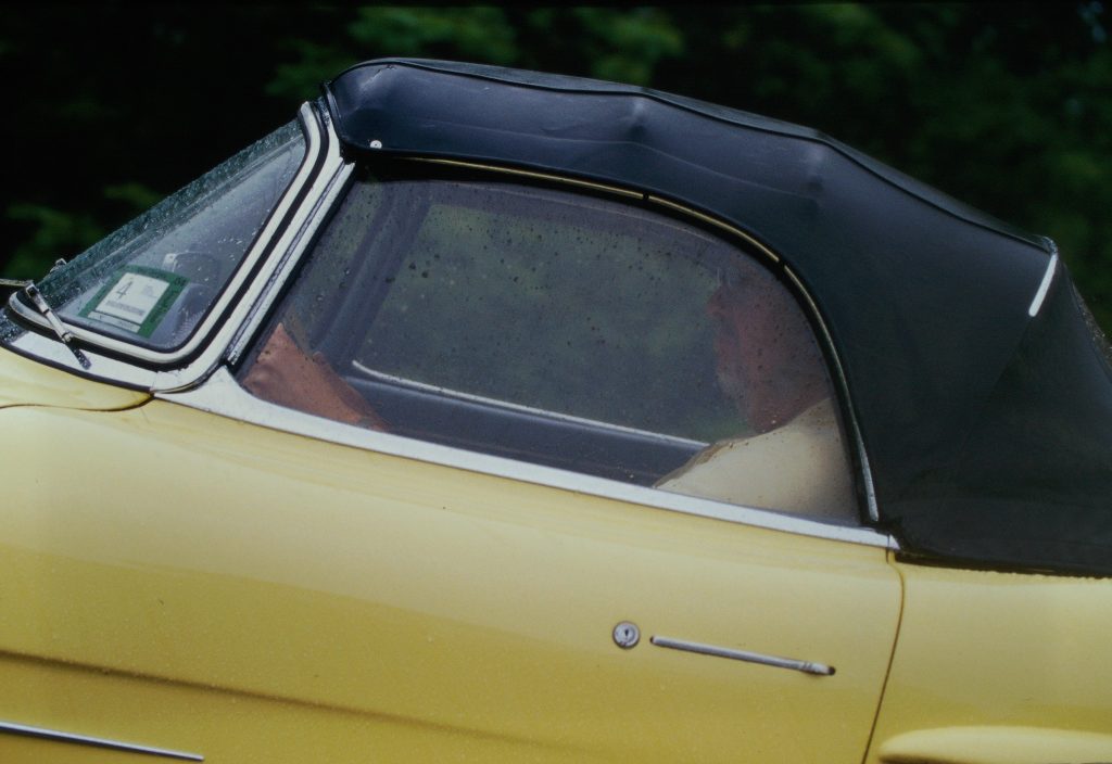 In a move that surprised us all (including his wife, I’m afraid), Charles Rosak, the owner of our yellow roadster, agreed to take it out – top up, of course – in the pouring rain. “After all,” he said, “it’s just a car.” Yep. Conservatively a $275,000 (in 2003 dollars – about 5 times that in 2025, give or take!) car, but who was I to argue? I felt a little (a LOT) like Ferris Bueller climbing behind the wheel of Cameron’s dad’s Ferrari California Spider.